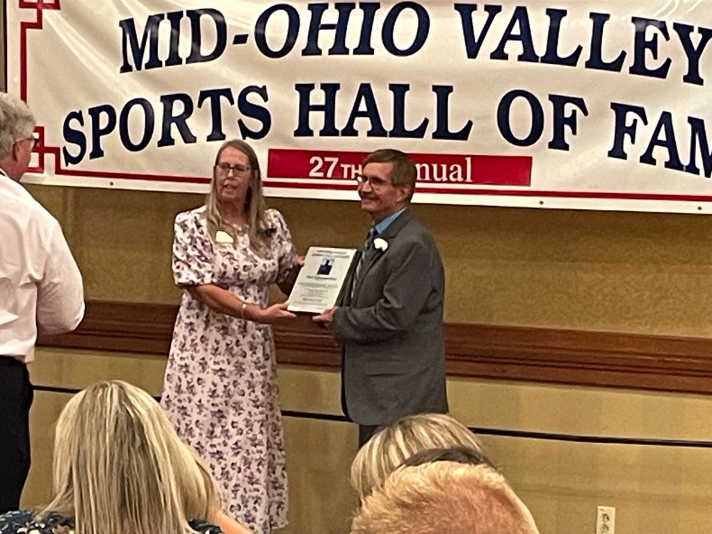 Dan Schweiterman from Noble County smiles as he receive his plaque from the MOVSHofF